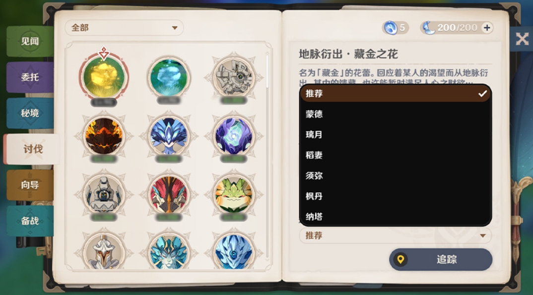 5、討伐新增地脈花,選擇地區(qū)后可一鍵追蹤,同時(shí)新增查看目標(biāo)首領(lǐng)特性/抗性/弱點(diǎn)的功能