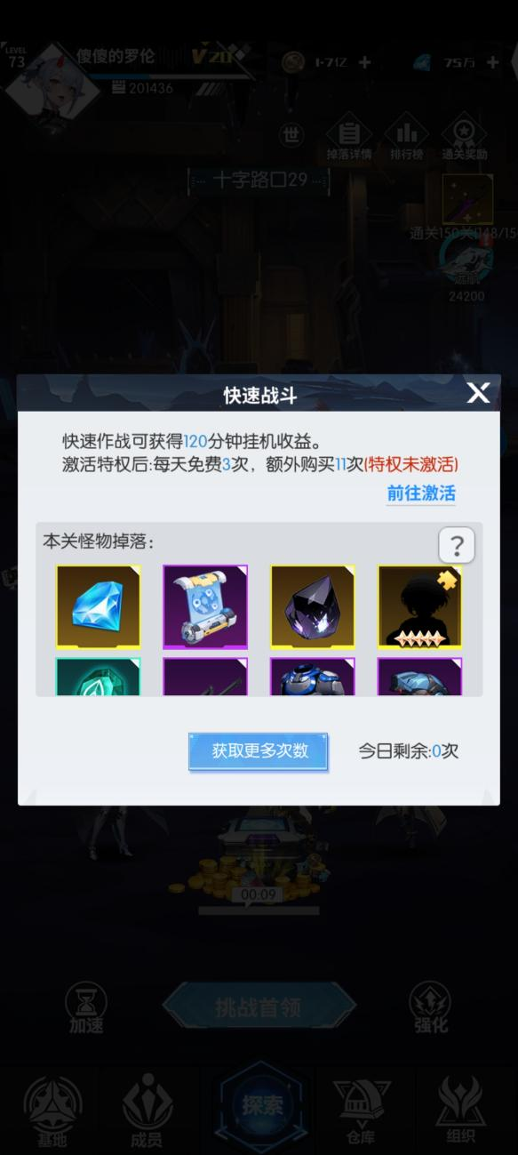 通過精神力點數提升冒險家等級,通過探索通關主線關卡、掛機兩個方式獲取,所以前期盡可能去通關主線關卡,掛機除了時間掛機還可點擊快速戰(zhàn)斗獲取120分鐘掛機效益,開通特權可增加次數;