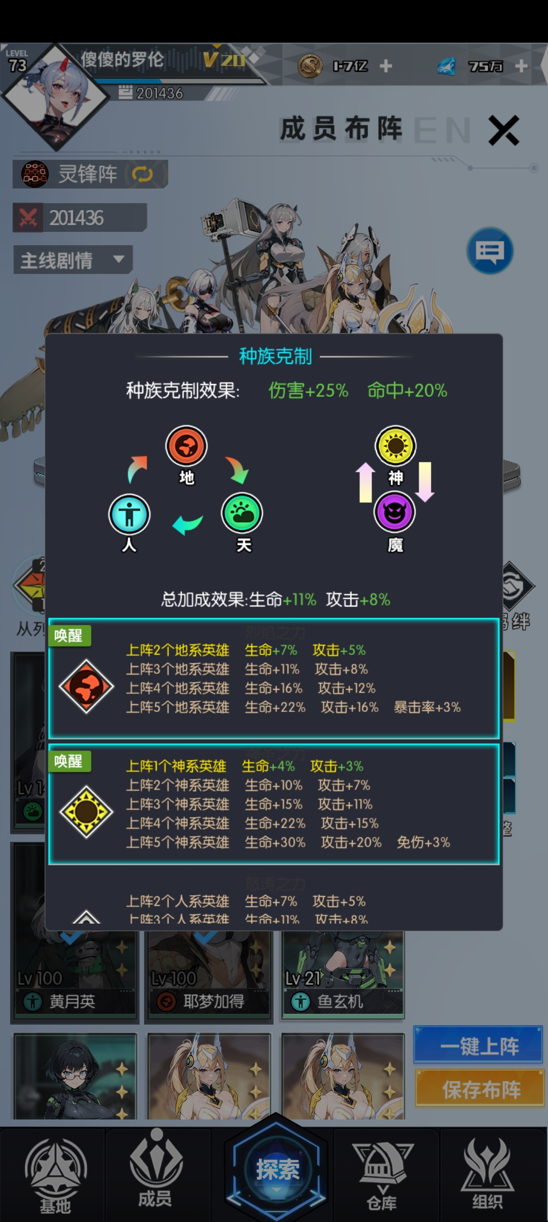 英雄分天、地、人及神、魔五個種族,種族之間有克制效果,部分英雄有羈絆加成;