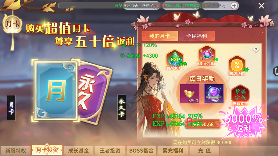 2、超值月卡永久卡微氪黨必備,性價比極高,新服特權(quán),提升戰(zhàn)力快人一步!